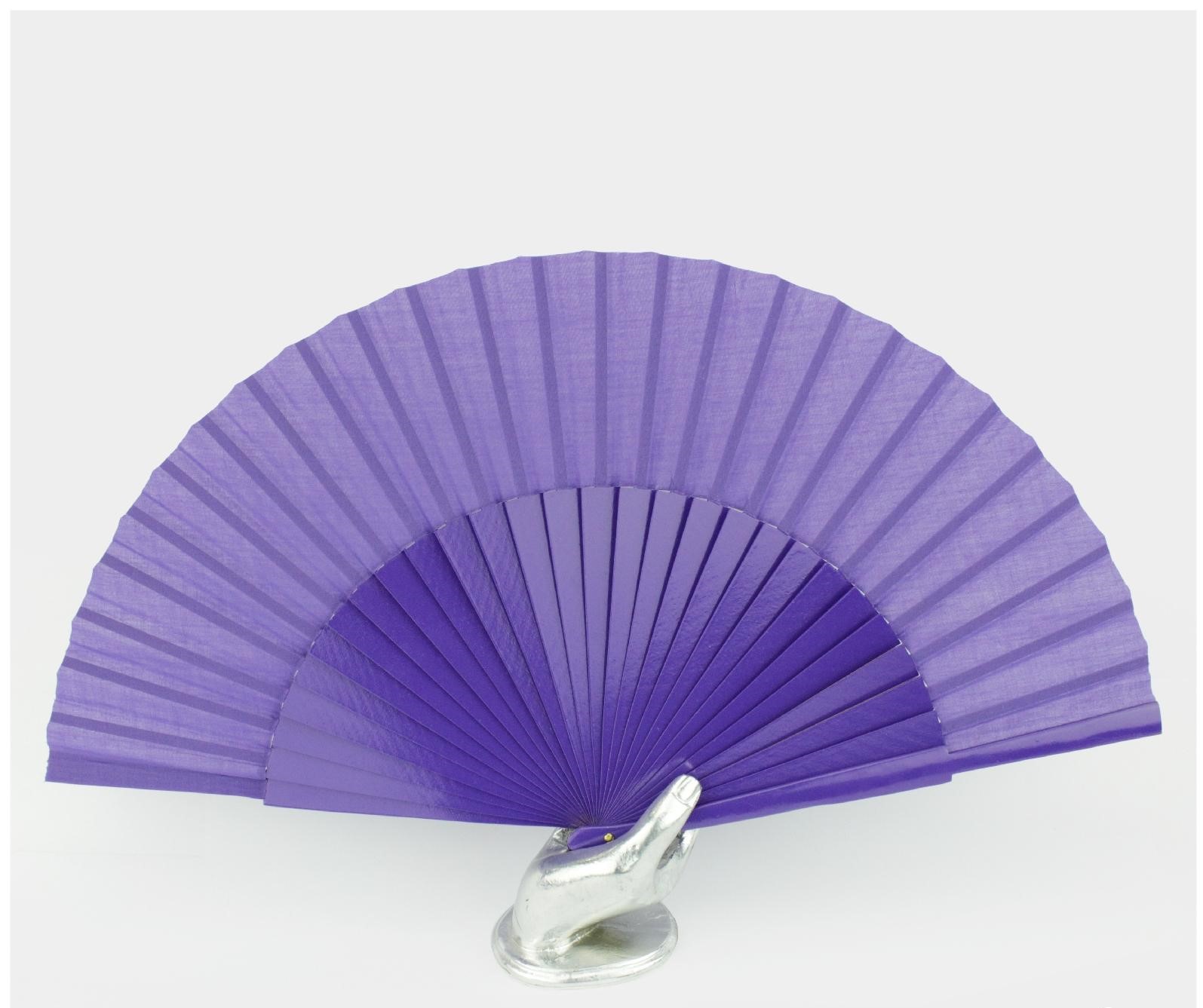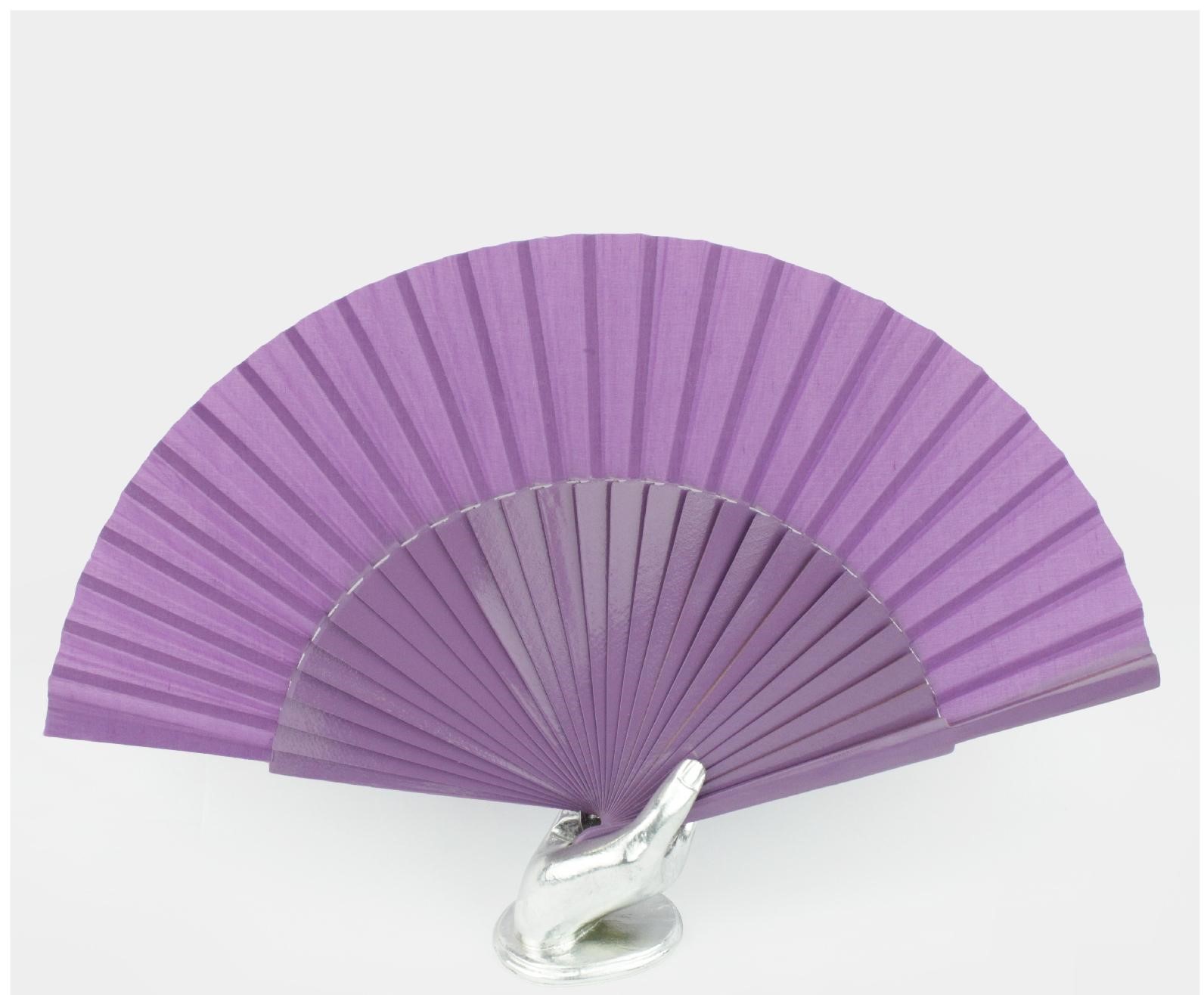 Leque lilás com guarda roxa segurado por mão decorativa branca.