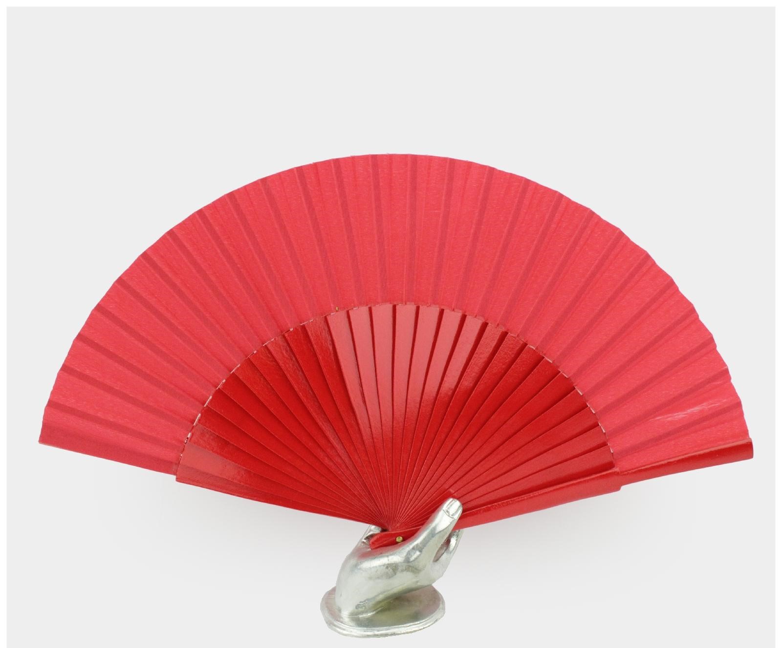 Leque laranja apoiado em mão prateada contra fundo cinza claro