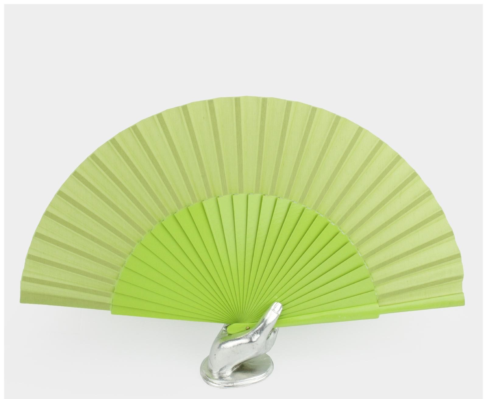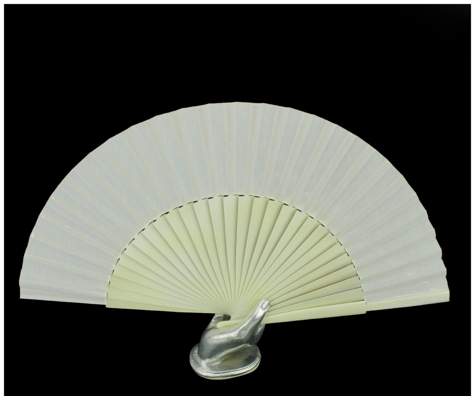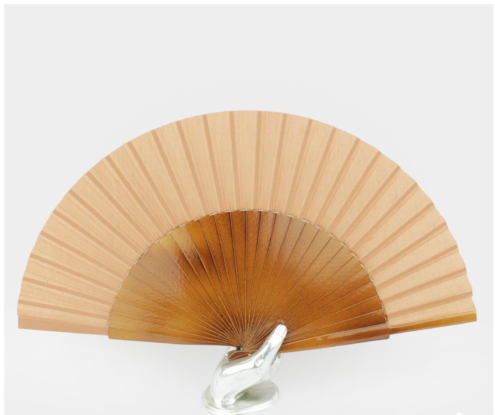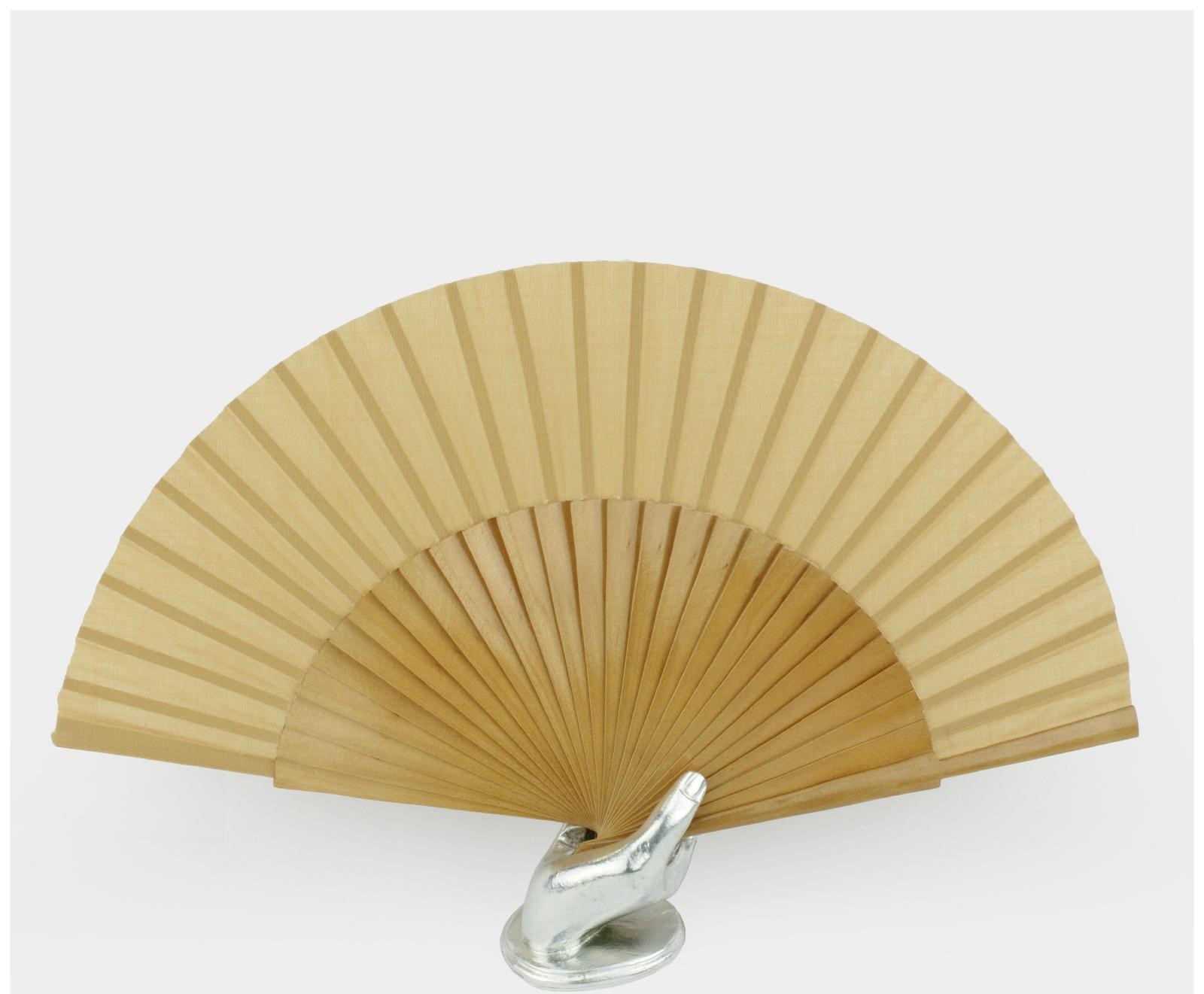 Leque bege em madeira e tecido fita numa mão decorativa prateada