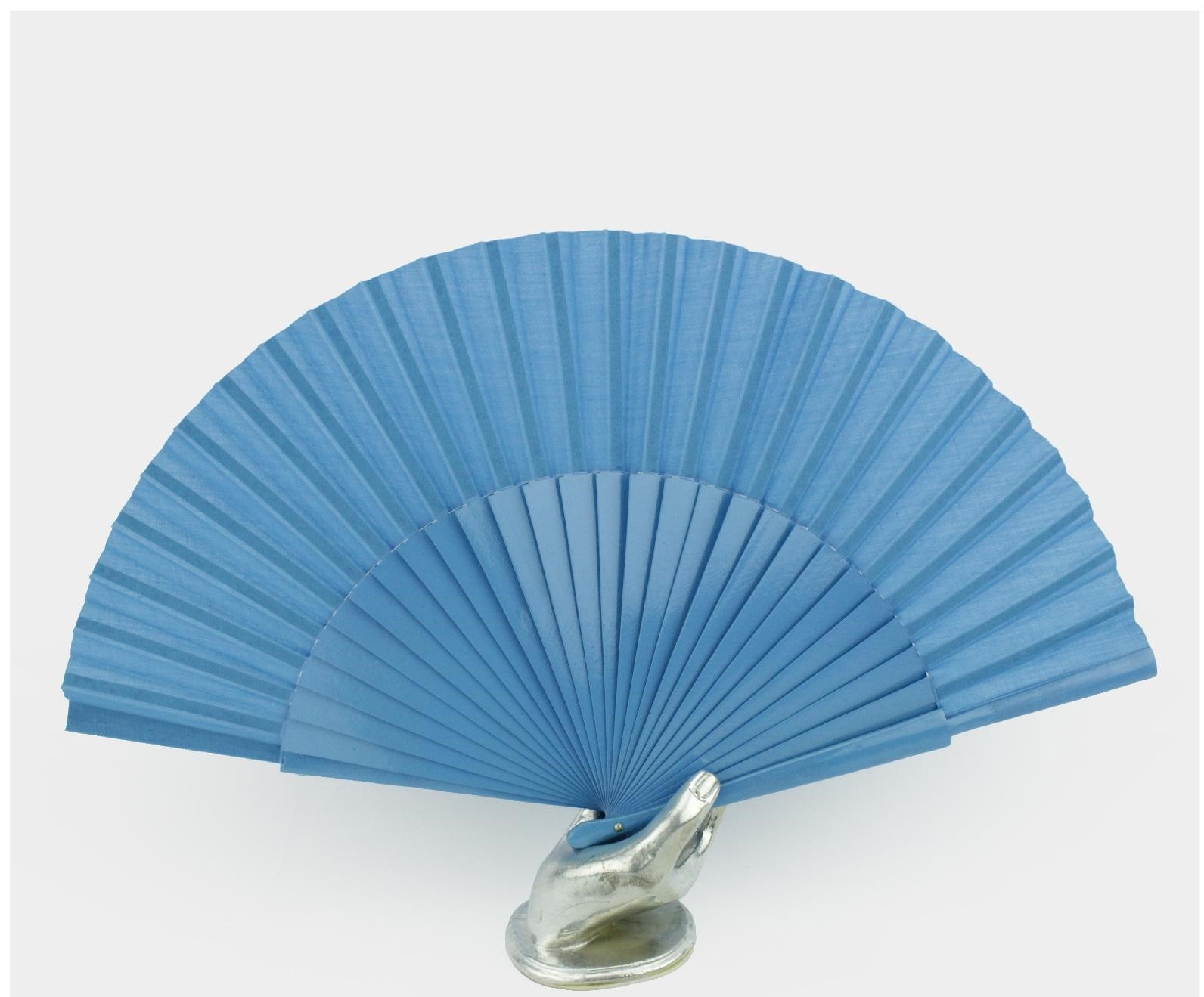 Leque azul claro em tecido apoiado em mão metálica prateada