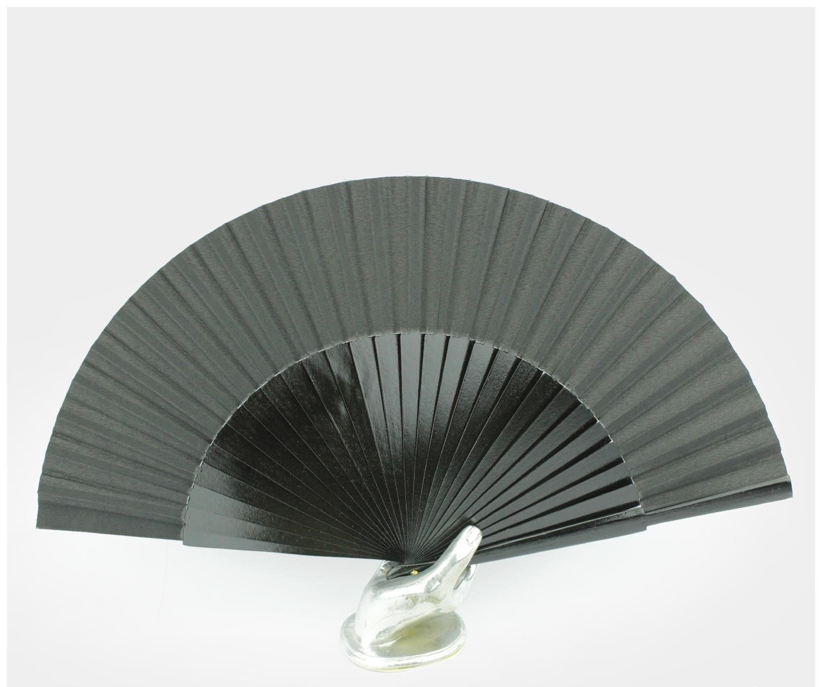 Leque preto com lâminas de madeira e pano, exibido numa base de vidro.