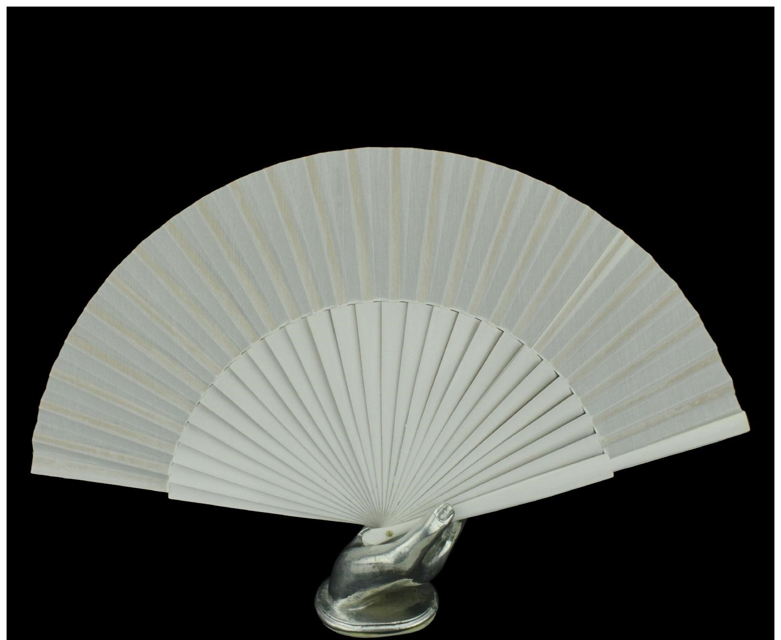 Leque de tecido branco com estrutura de madeira em apoio metálico