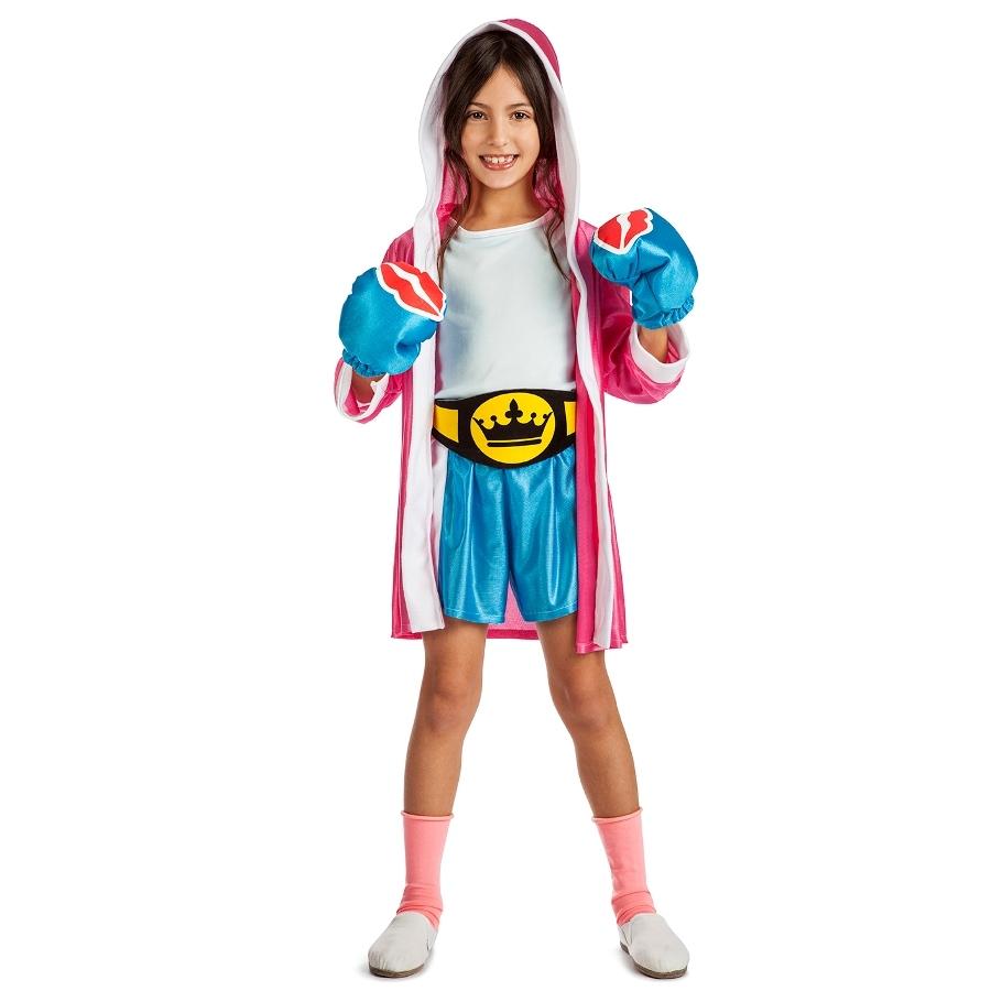 Menina em fato de boxe rosa, azul e branco com luvas e cinto amarelo com coroa preta