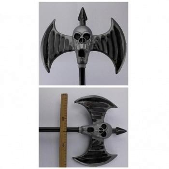Arma decorativa metálica em forma de machado com caveiras e régua para escala