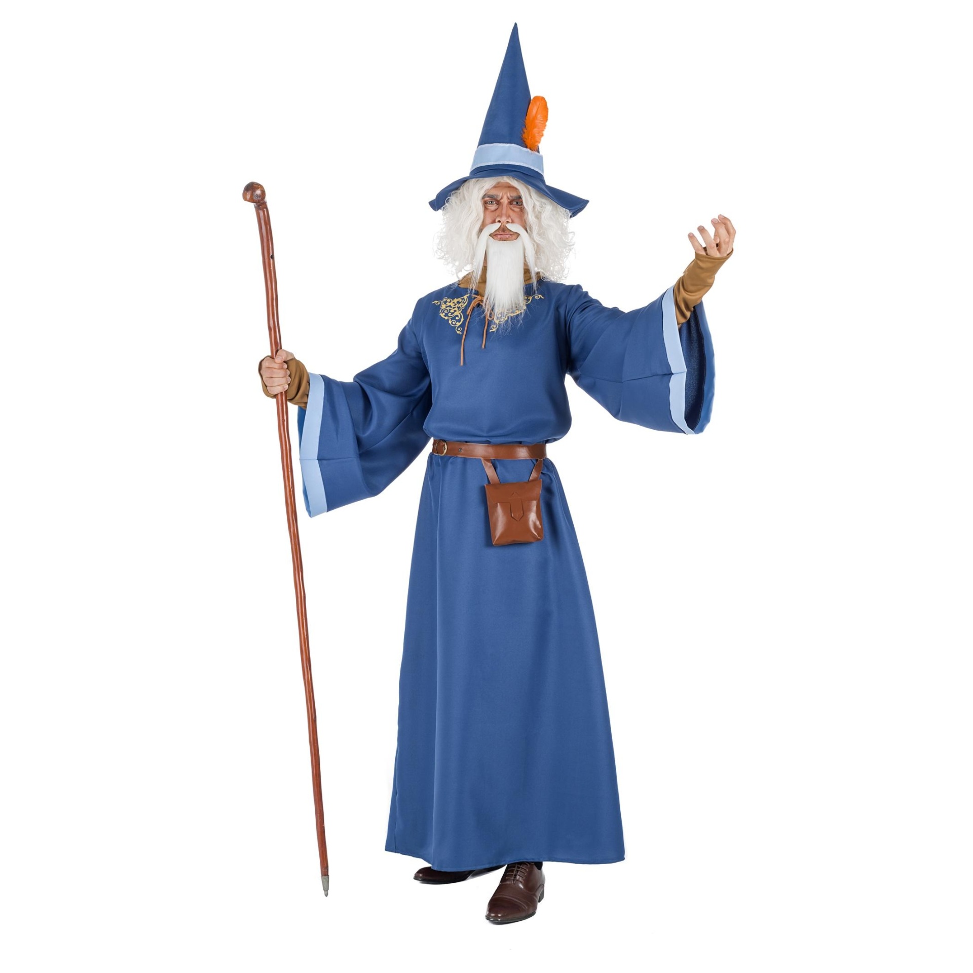 Fato de bruxo azul com chapéu e cajado