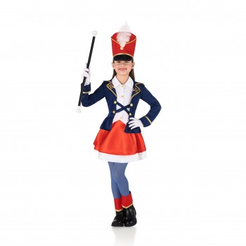 Criança vestida com traje de majorete com casaco azul, saia vermelha e chapéu vermelho