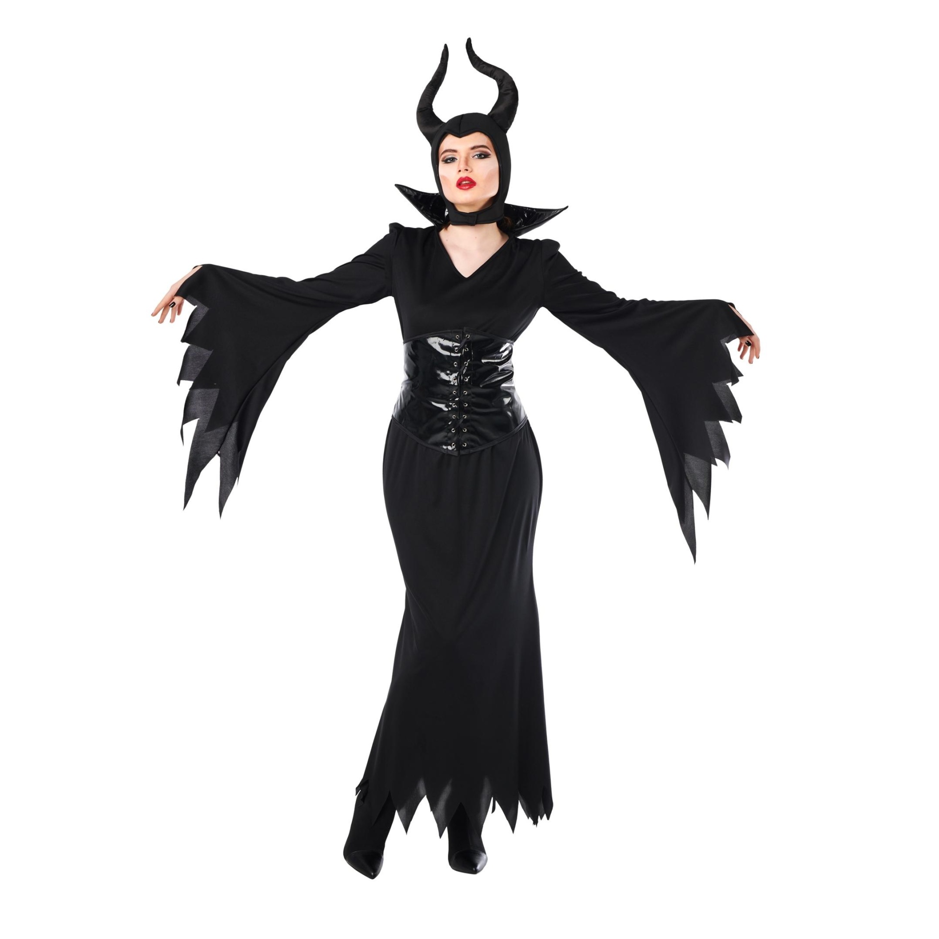 Fantasia preta com vestido longo, corselete e capuz com chifres.