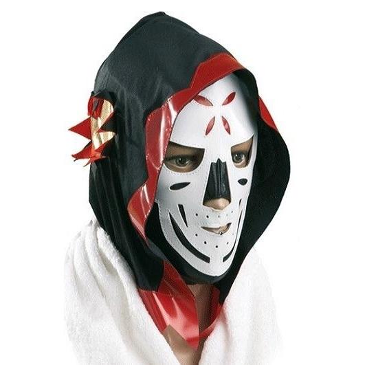 Máscara branca com padrões vermelhos e pretos com capuz preto e vermelho e toalha branca