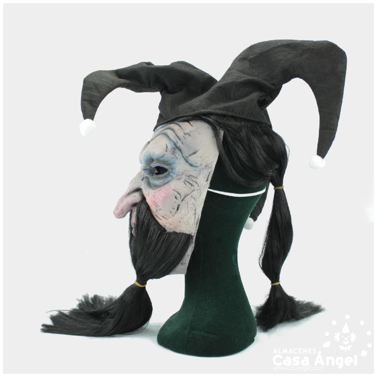 Máscara de bruxa com chapéu preto e cabelo em tranças