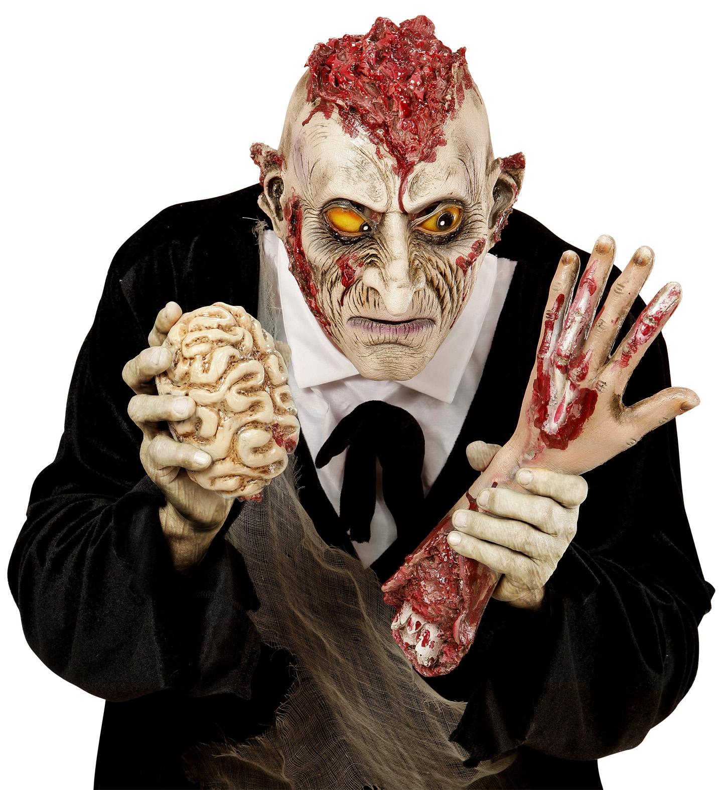Máscara e fantasia de zombie segurando cérebro e braço falso com sangue
