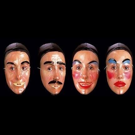 Quatro máscaras faciais decorativas com diferentes expressões e maquilhagem colorida.