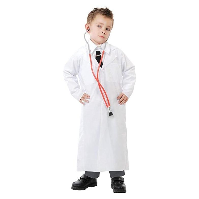 Criança vestindo bata branca de médico com estetoscópio cor-de-laranja