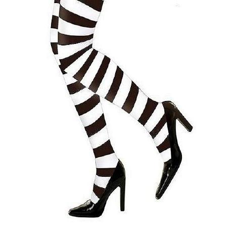 Meias listradas preto e branco com sapatos de salto alto pretos
