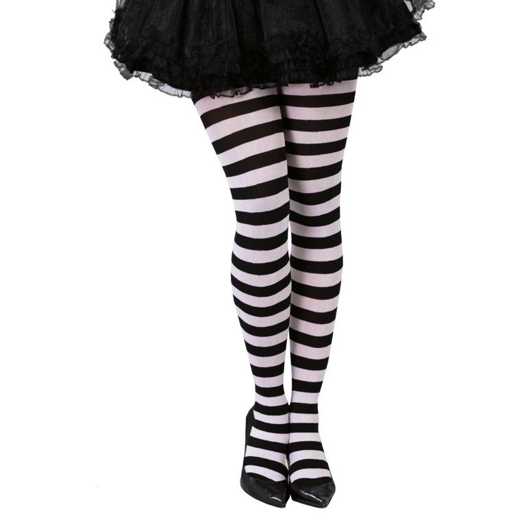 Meias às riscas preto e branco com sapatos pretos e saia preta folhada