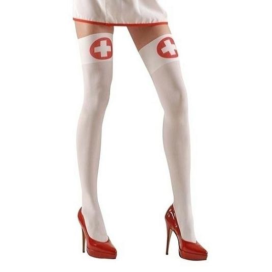 Meias brancas com cruz vermelha e sapatos vermelhos de salto alto