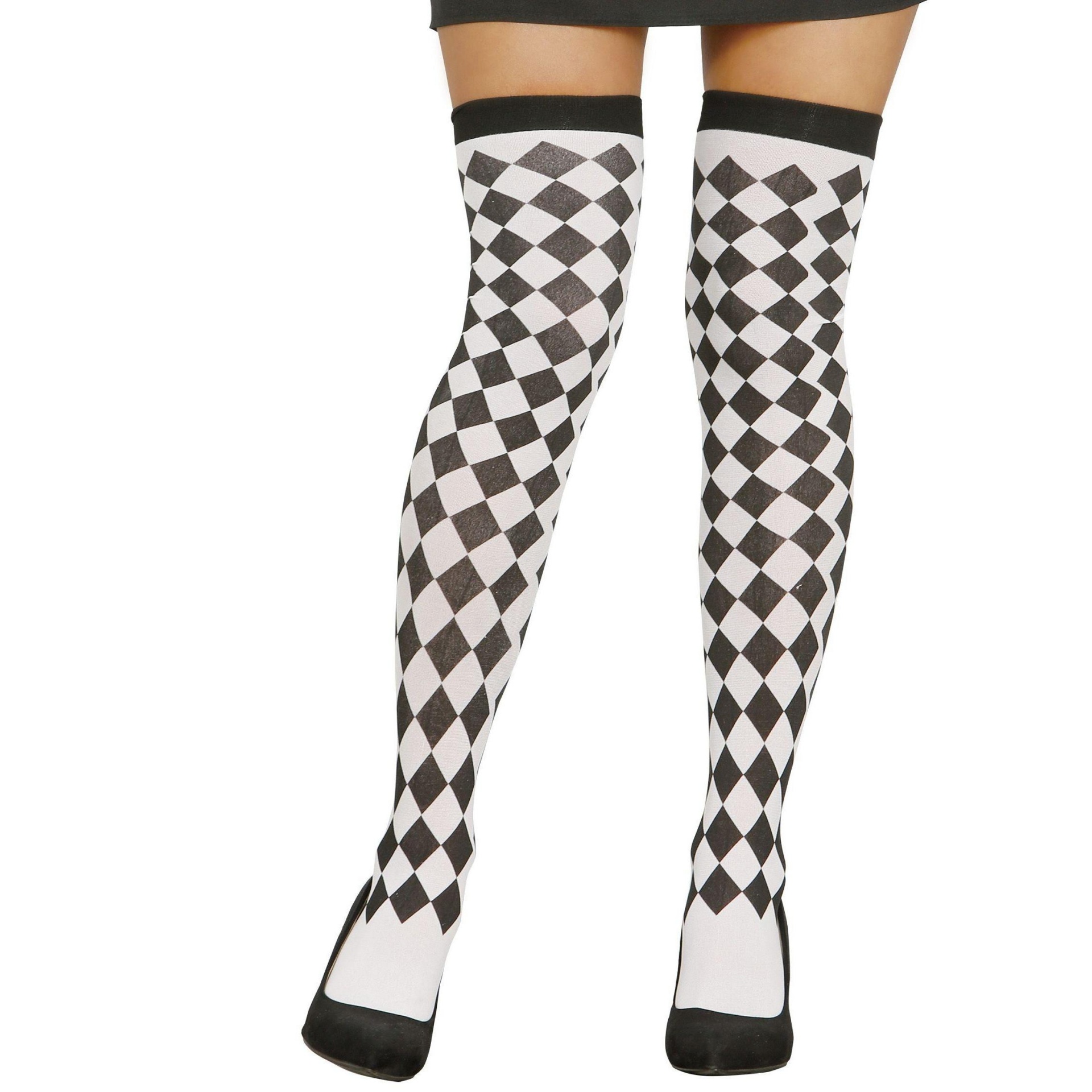 Meias acima do joelho pretas e brancas com padrão quadriculado
