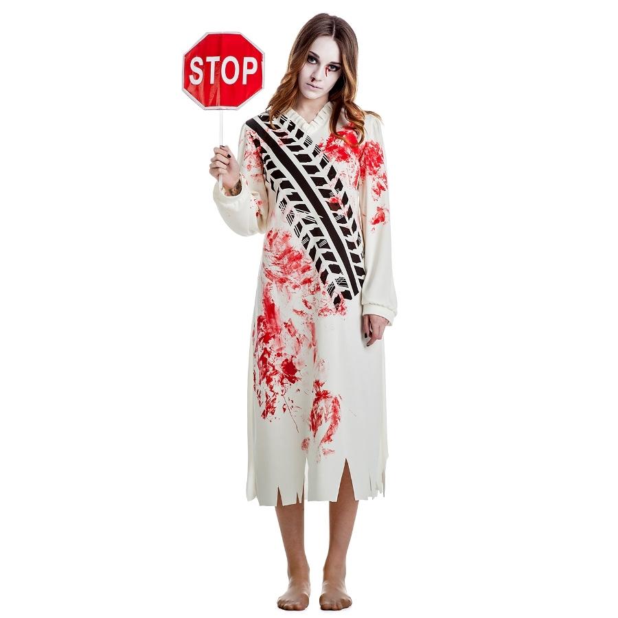 Modelo com vestido branco manchado de vermelho e faixa preta com padrão tribal, segurando placa STOP