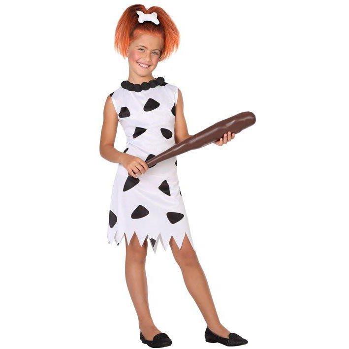 Criança vestida com fantasia branca com manchas pretas segurando objeto longo castanho