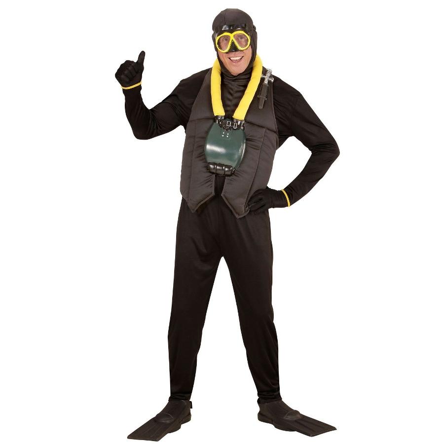 Fato completo preto de mergulho com máscara amarela e tinteiros verdes