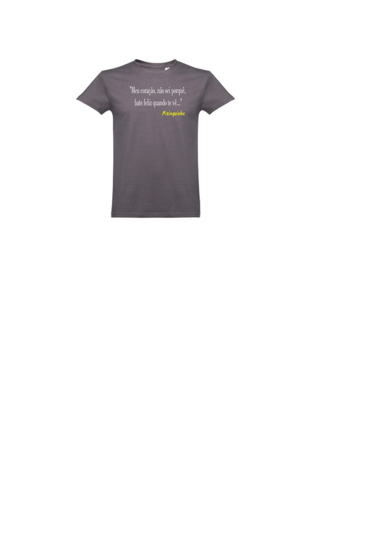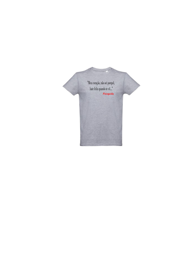 T-shirt cinzenta com texto impresso e assinatura no peito