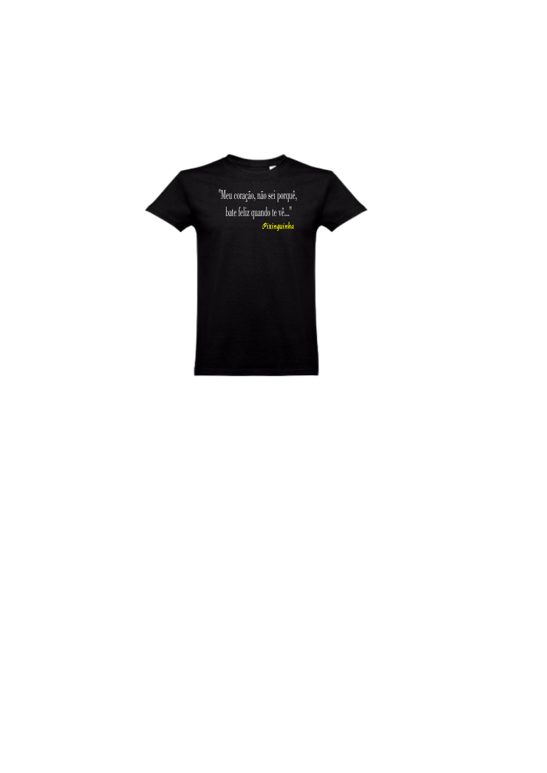 T-shirt preta com frase impressa na frente em branco e amarelo
