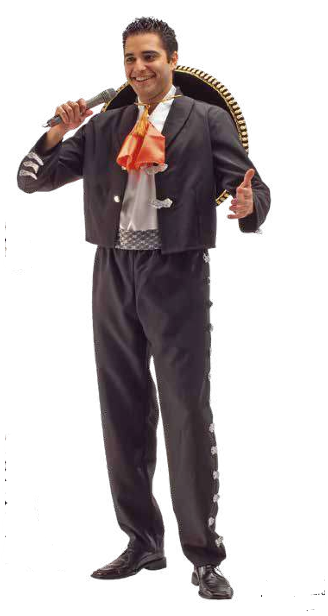 Homem de fato tradicional de mariachi preto a segurar um microfone