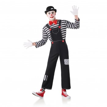 Fato de palhaço com camisa às riscas preto e branco, calças pretas, sapatos vermelhos, gravata vermelha, luvas brancas e chapéu preto.
