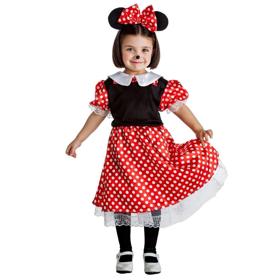Criança vestida com fantasia inspirada na Minnie, características vermelhas, pretas e brancas.