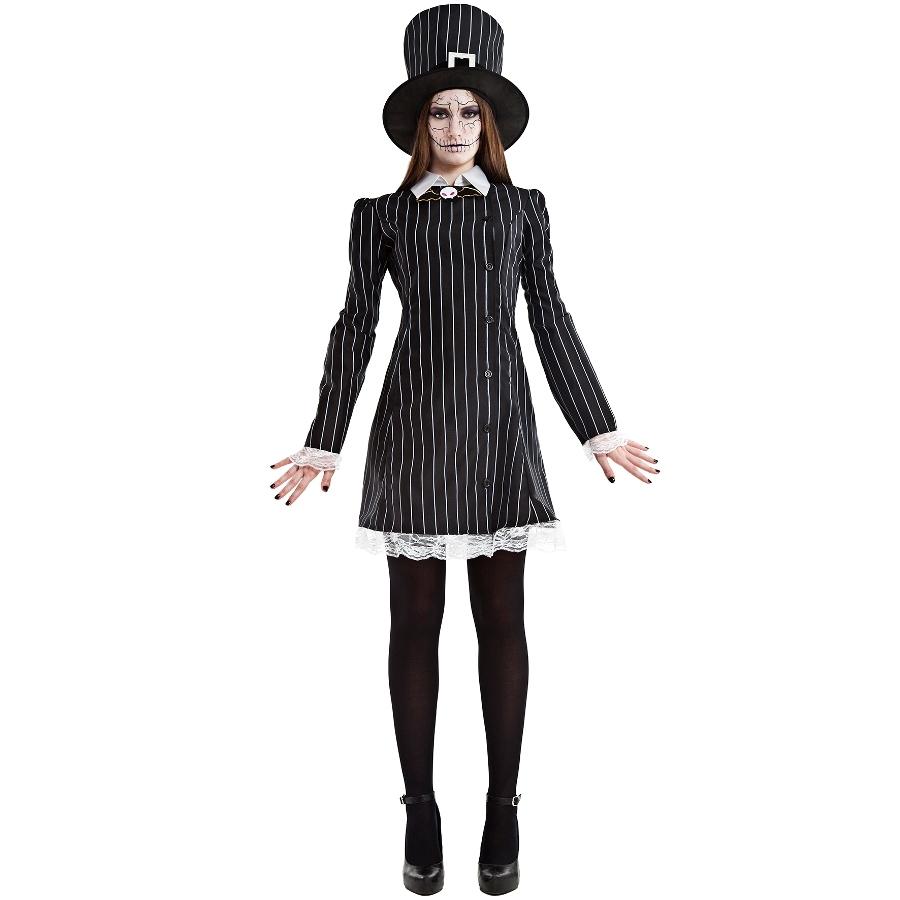 Fantasia de vestido riscado preto com chapéu alto e maquilhagem de caveira.