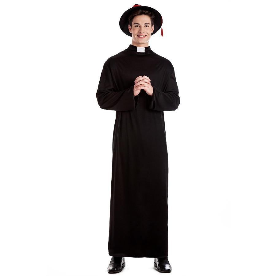 Traje religioso preto comprido com gola branca e chapéu preto com faixa vermelha