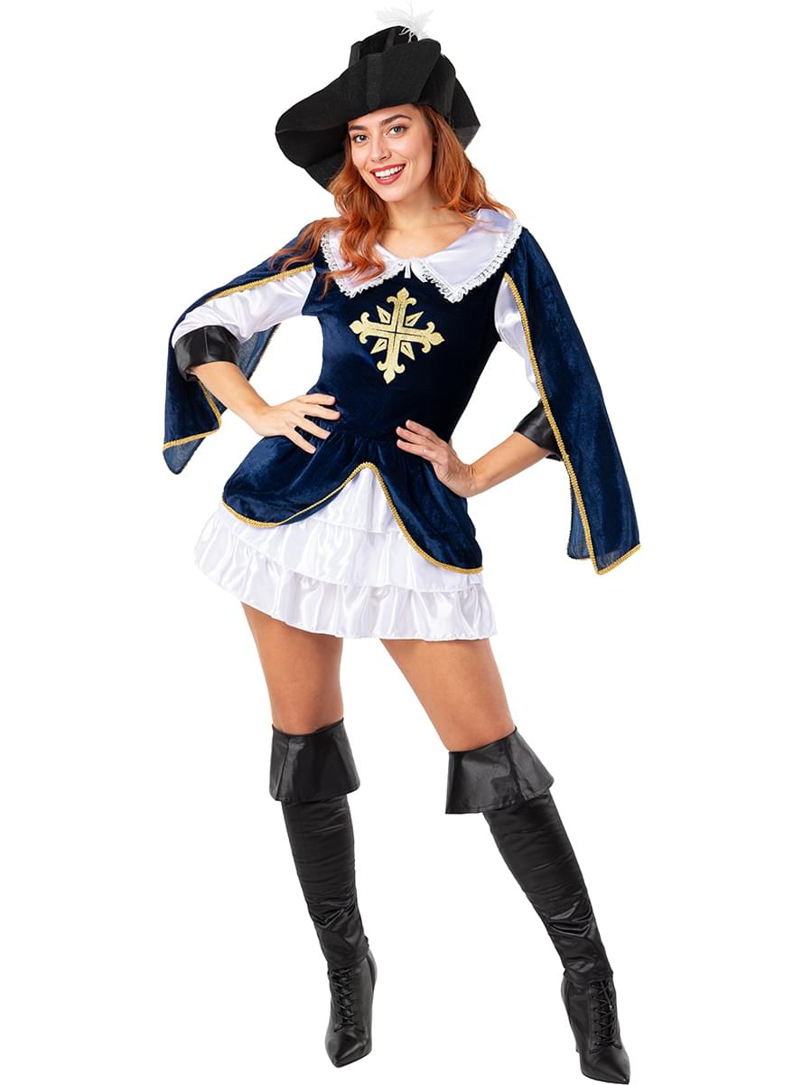 Fato azul escuro com saia branca, botins pretos e chapéu preto com pena branca