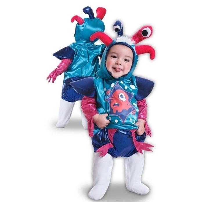 Fato de criança azul e rosa com olhos e antenas, estampa de monstro, pernas brancas