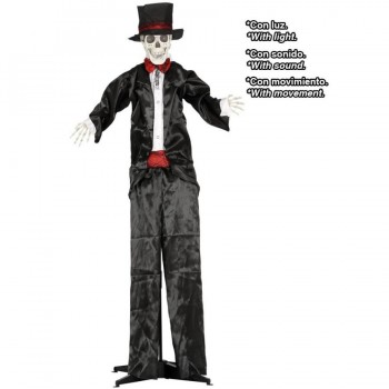 Figura decorativa esqueleto com luzes, som e movimento vestida de preto e vermelho