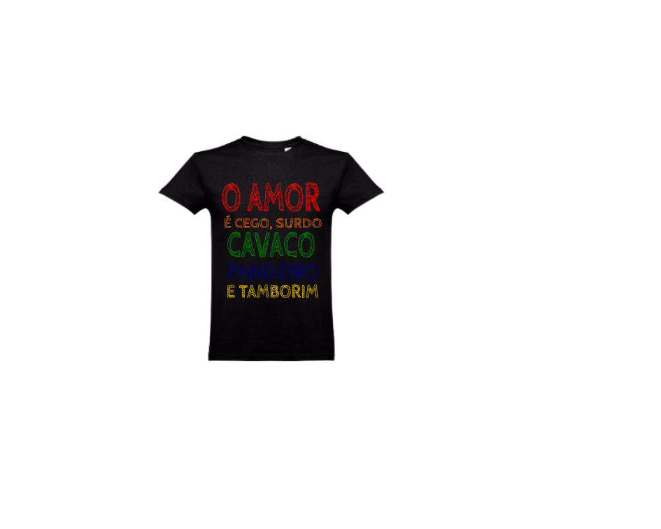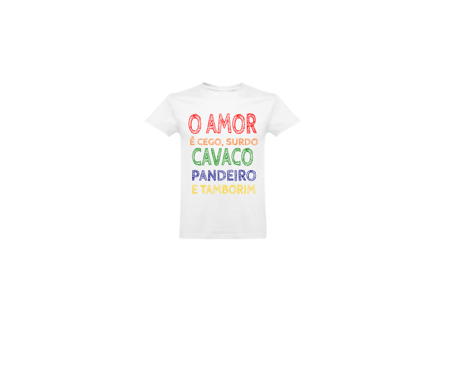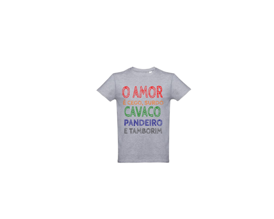 T-shirt cinzenta com texto colorido sobre amor e instrumentos musicais tradicionais.