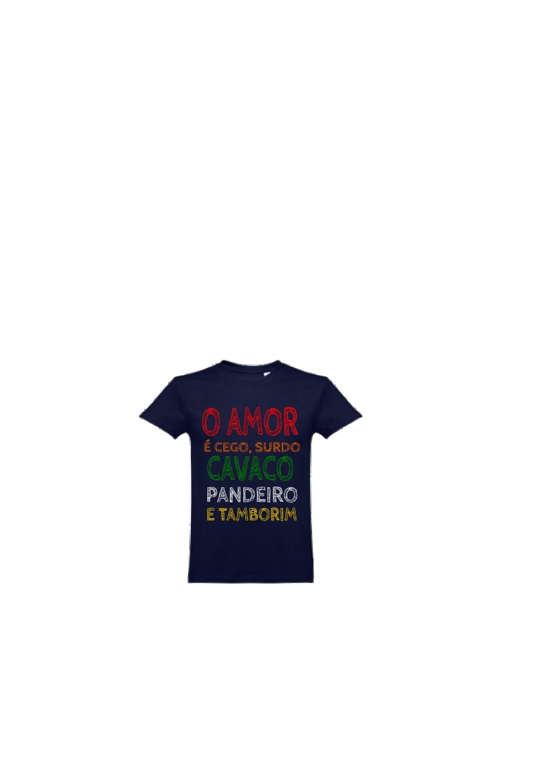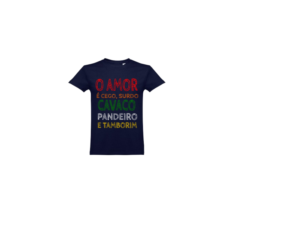 T-shirt azul escuro com texto colorido em português