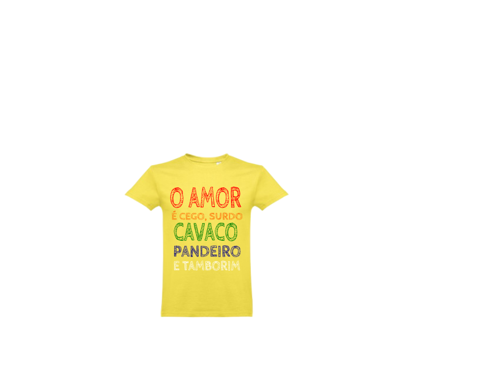 T-shirt amarela com texto colorido em português.