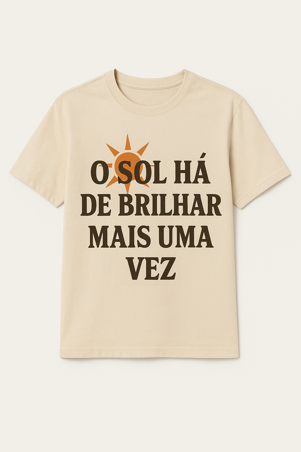T-shirt bege com texto e sol estilizado em preto e laranja