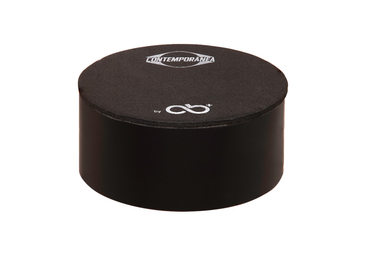 Embalagem redonda preta com texto CONTEMPORANIA na tampa