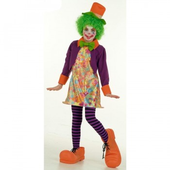 fato de palhaço colorido para criança com peruca verde e sapatos laranja grandes