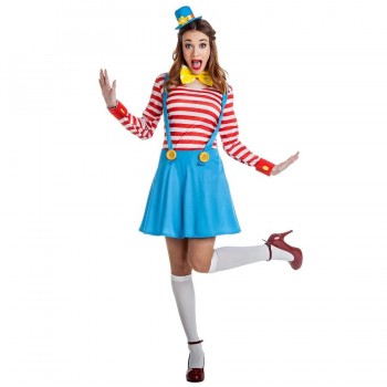Fantasia feminina colorida com vestido azul e camisa às riscas