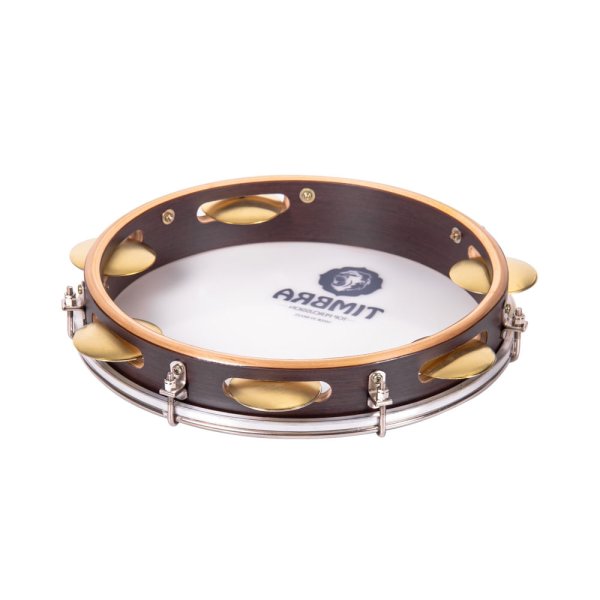 Pandeireta madeira escura com pele branca e castanholas douradas