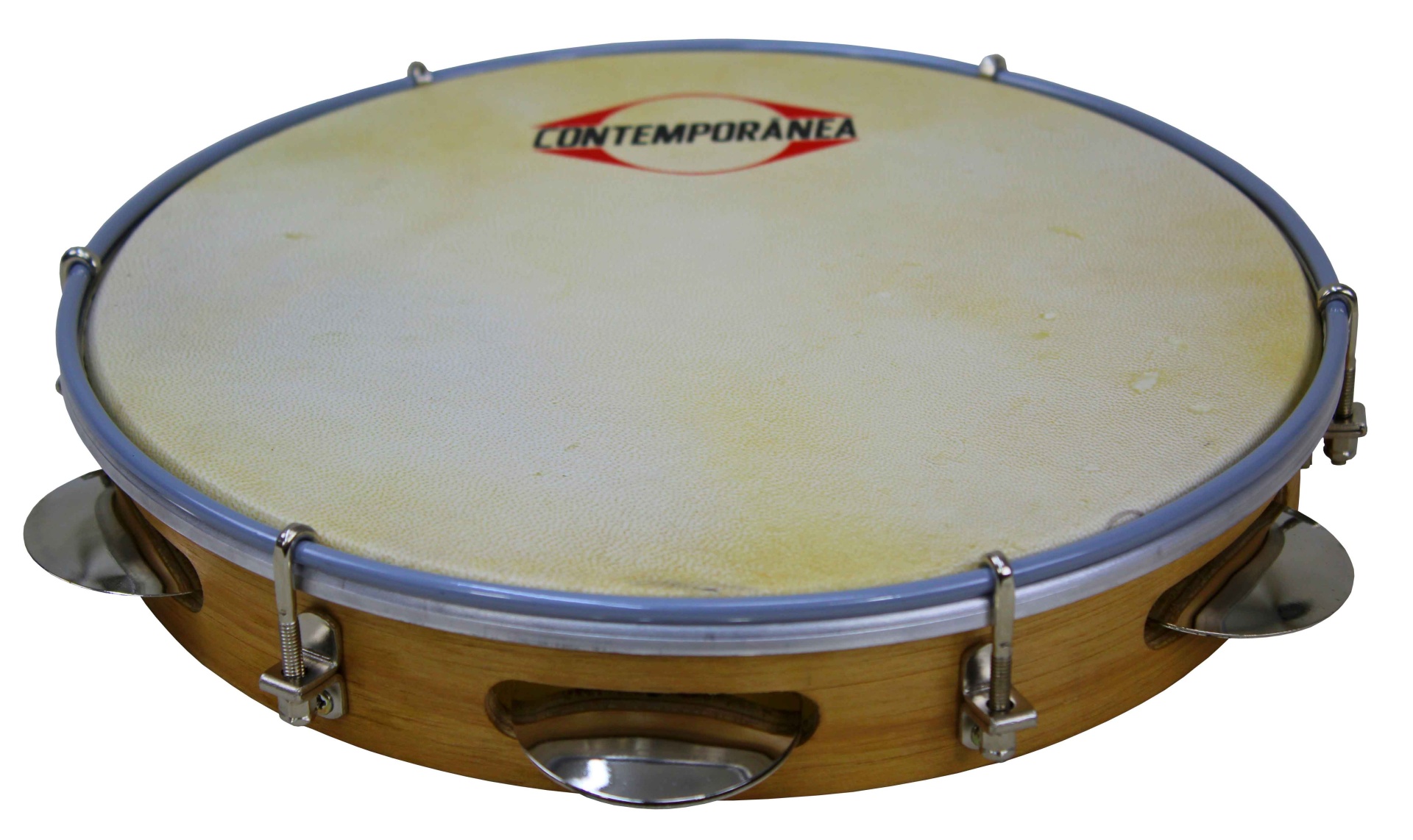 Pandeireta de madeira com pele e aro metálico, marca INTEMPORANEA