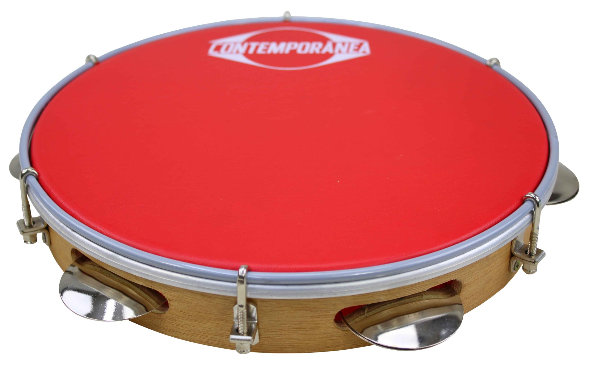 Pandeireta com pele vermelha e aro metálico prateado