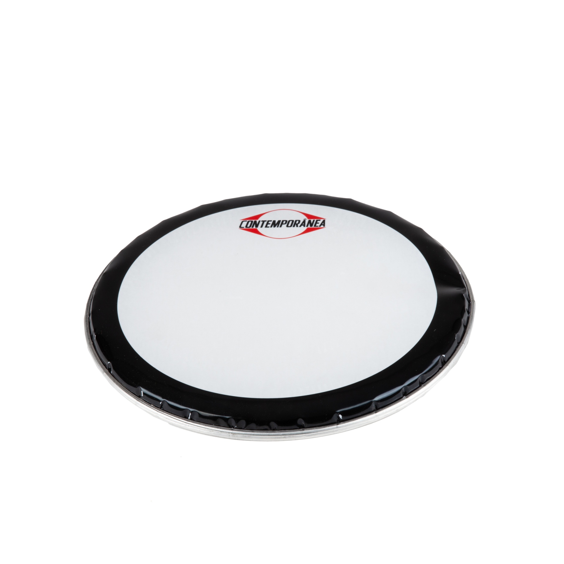 Prato descartável redondo branco com borda preta e texto CONTEMPORANEA no centro.