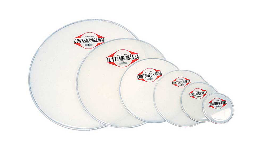 Cinco peles de bateria brancas CONTEMPORANEA de tamanhos diferentes num fundo branco