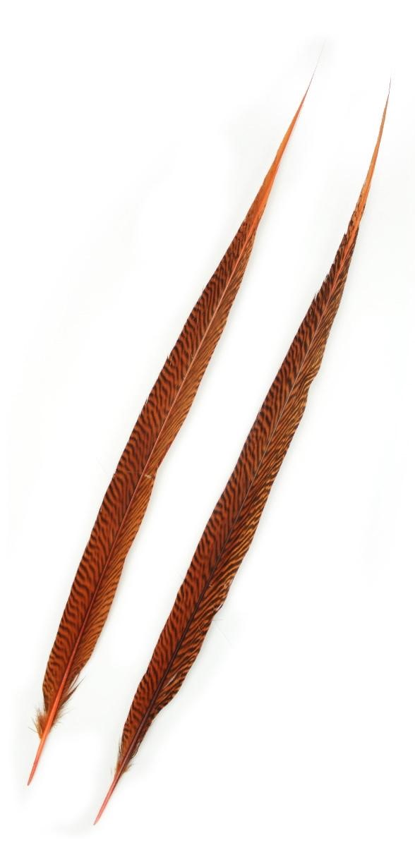 Duas penas longas castanho-alaranjadas com padrão riscado