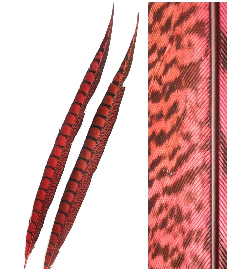 Duas penas vermelhas finas com padrões pretos e textura detalhada ao lado direito
