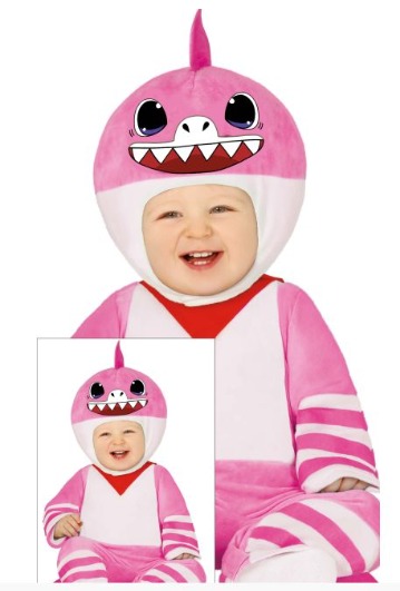 Bebé com fantasia rosa e branca de tubarão com detalhes vermelhos