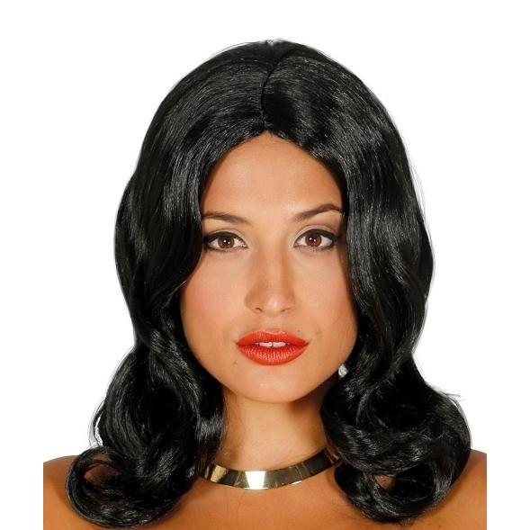 Peruca preta sintética lisa com pontas onduladas, modelo com maquilhagem e fundo branco