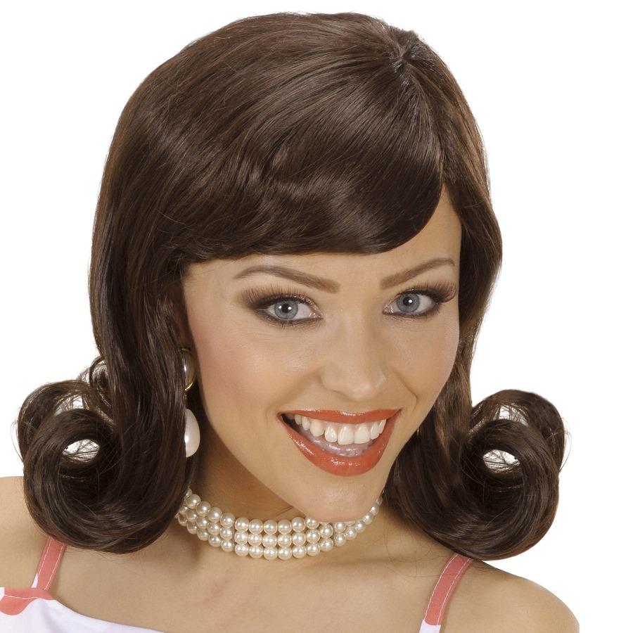 Mulher com peruca castanha ondulada, colar de pérolas e maquilhagem
